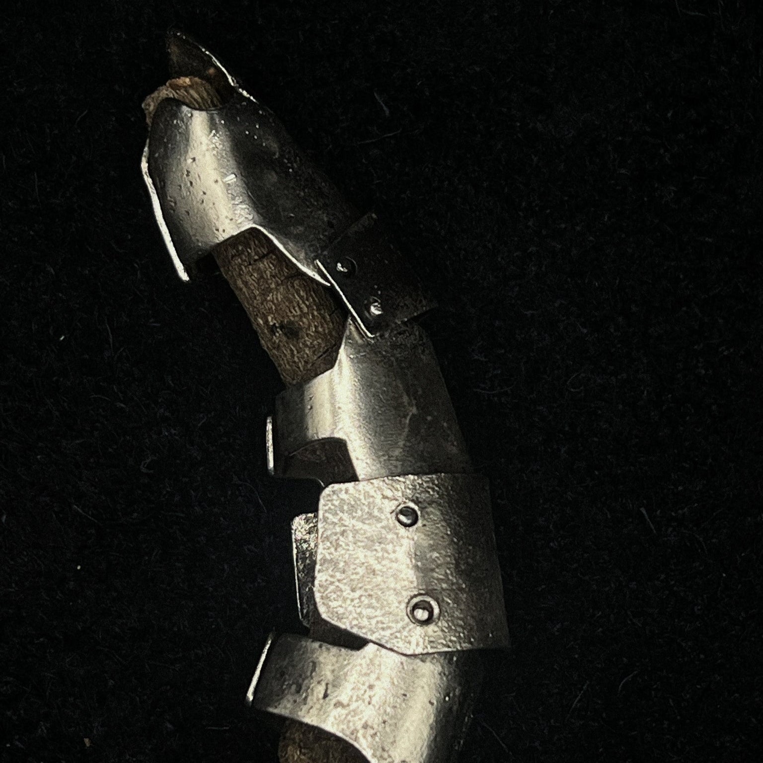 a complete articulated 925 silver armor ring with an acid and heat treatement finish.