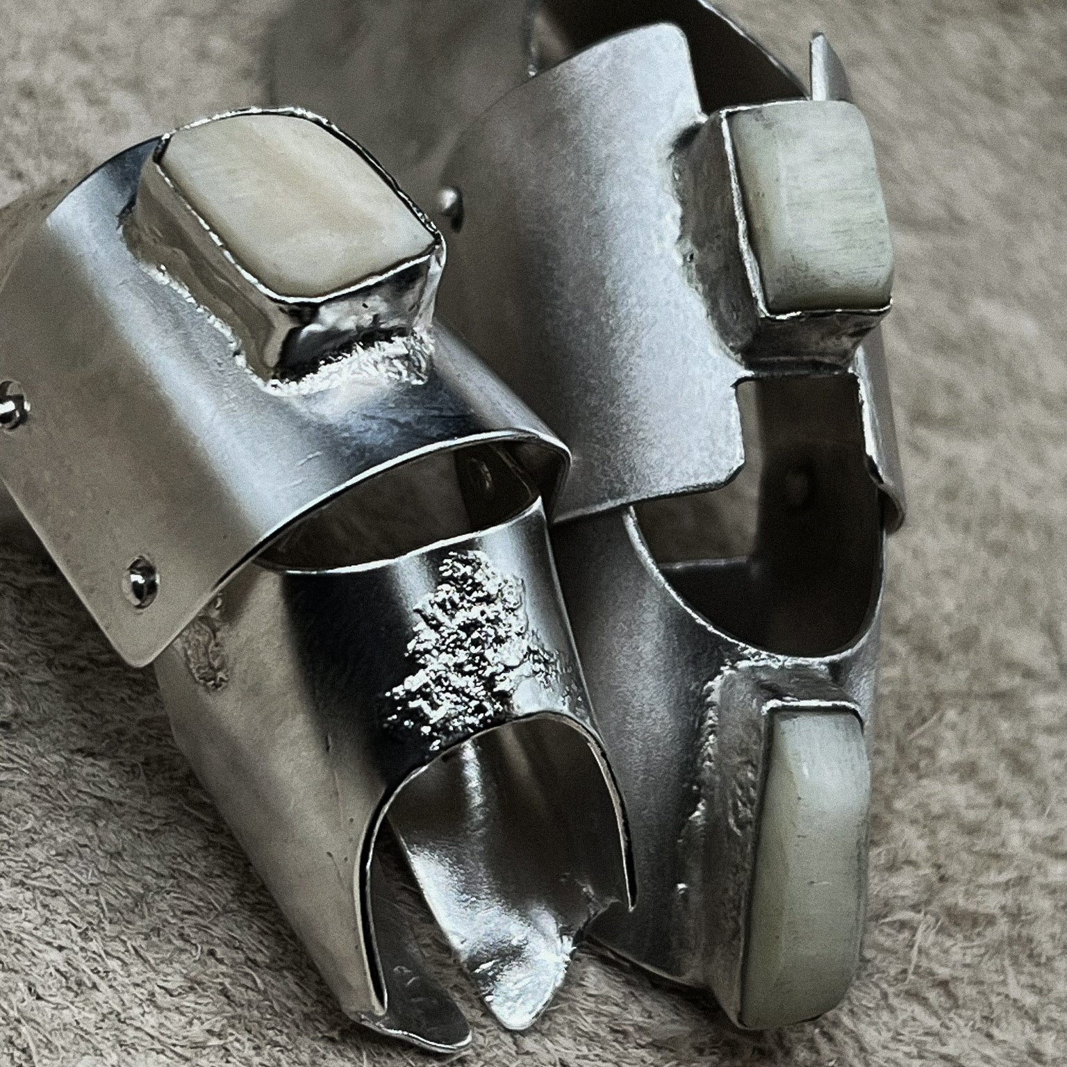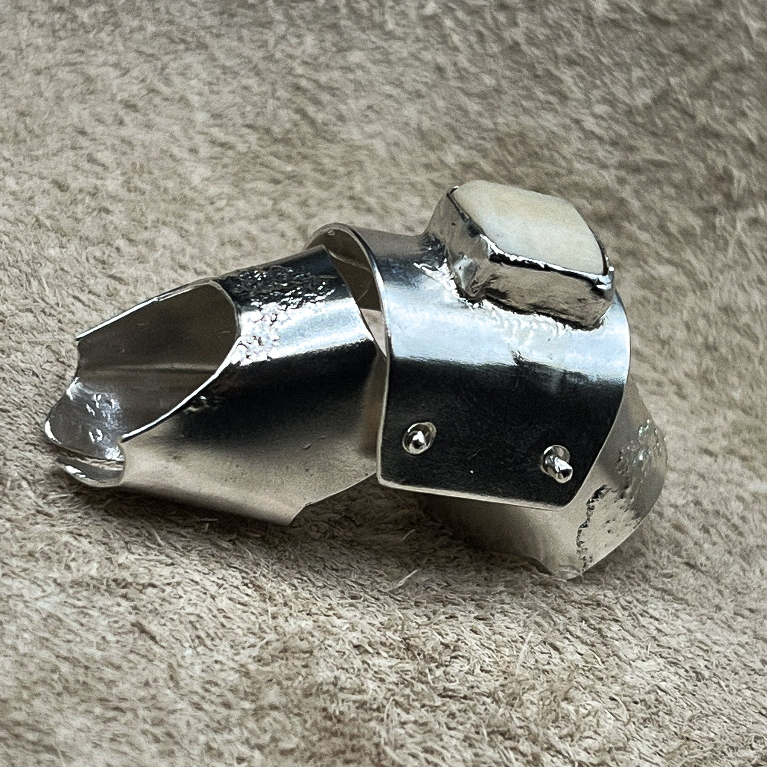 half finger articulated 925 silver armor ring with one antique ivory inlay and a custom textured shiny finish. This piece is meant to be worn at the end of one's finger, leaving space for your nail